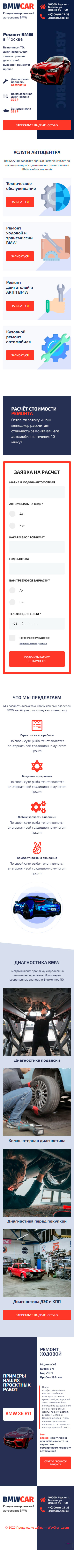 - Промоблок "Ремонт BMW в Москве" с кнопкой призыва к действию "Записаться на диагностику"