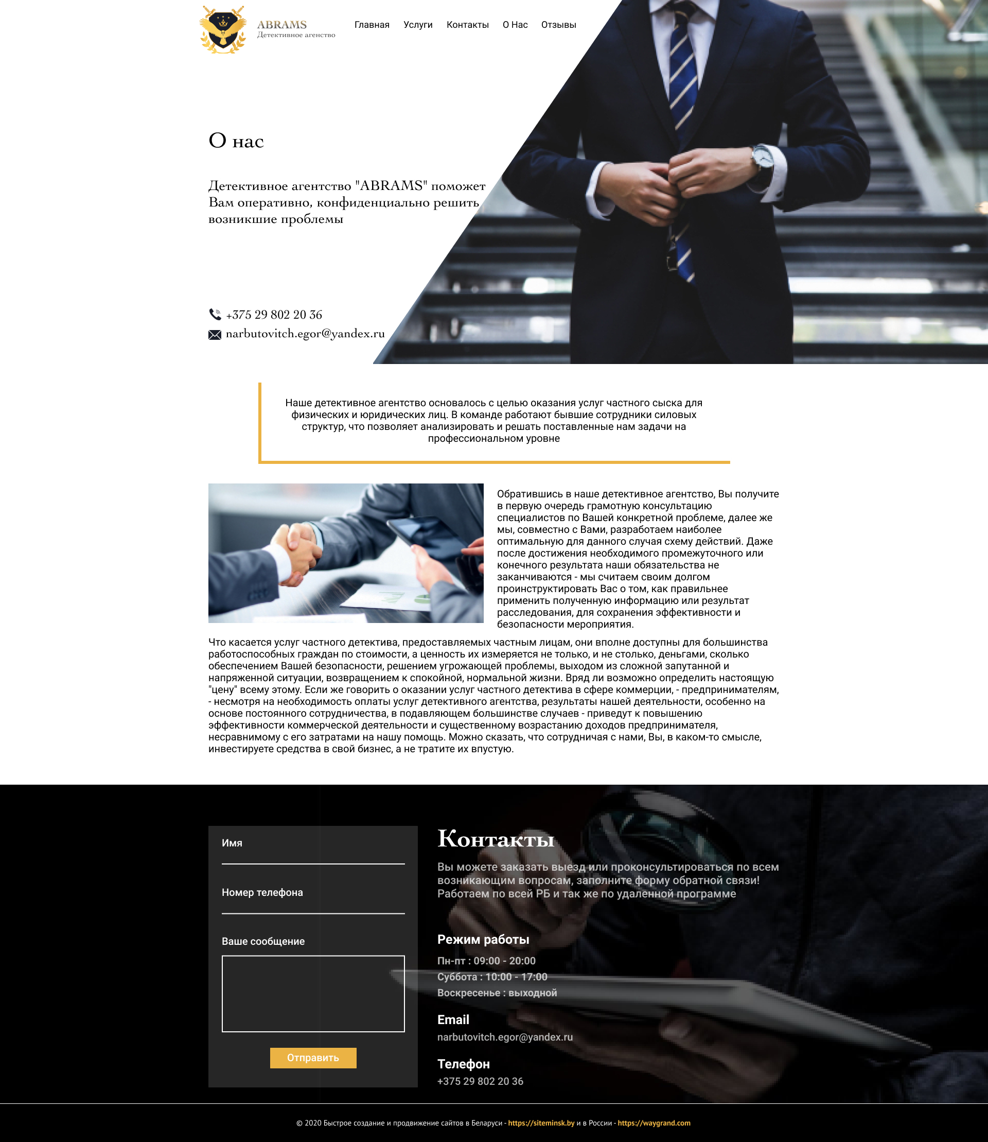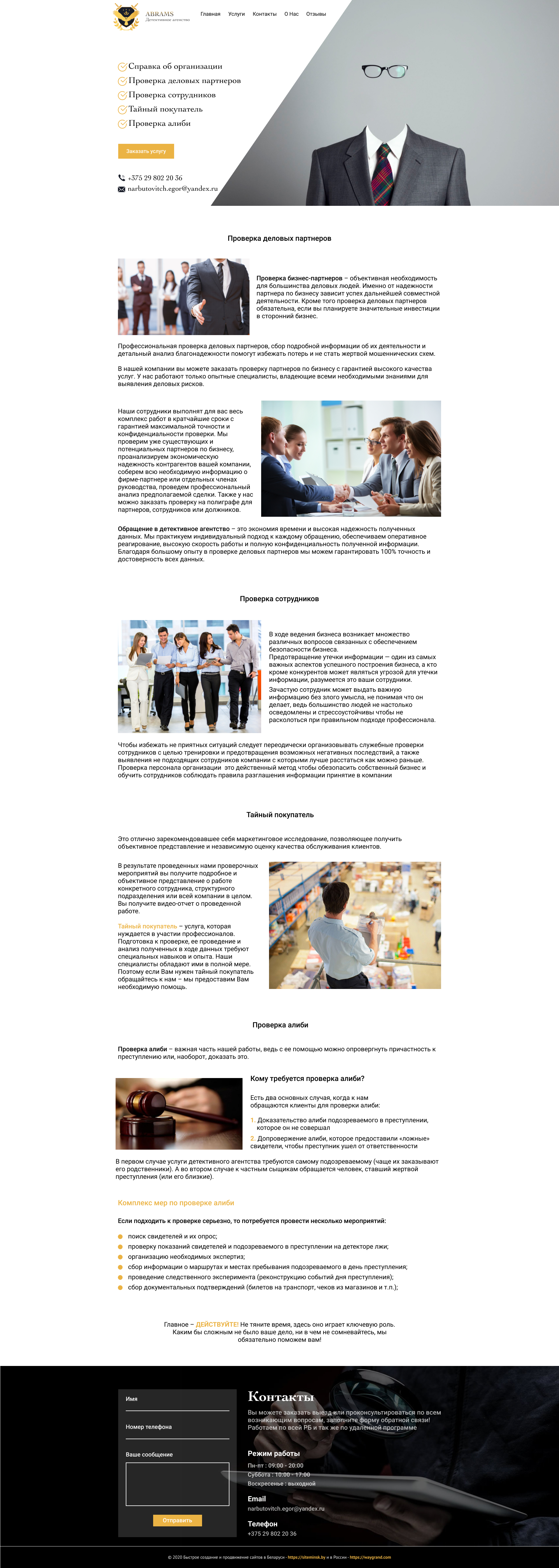 - Промоблок "Частное детективное агентство" с кнопкой призыва к действию "Заказать услугу"